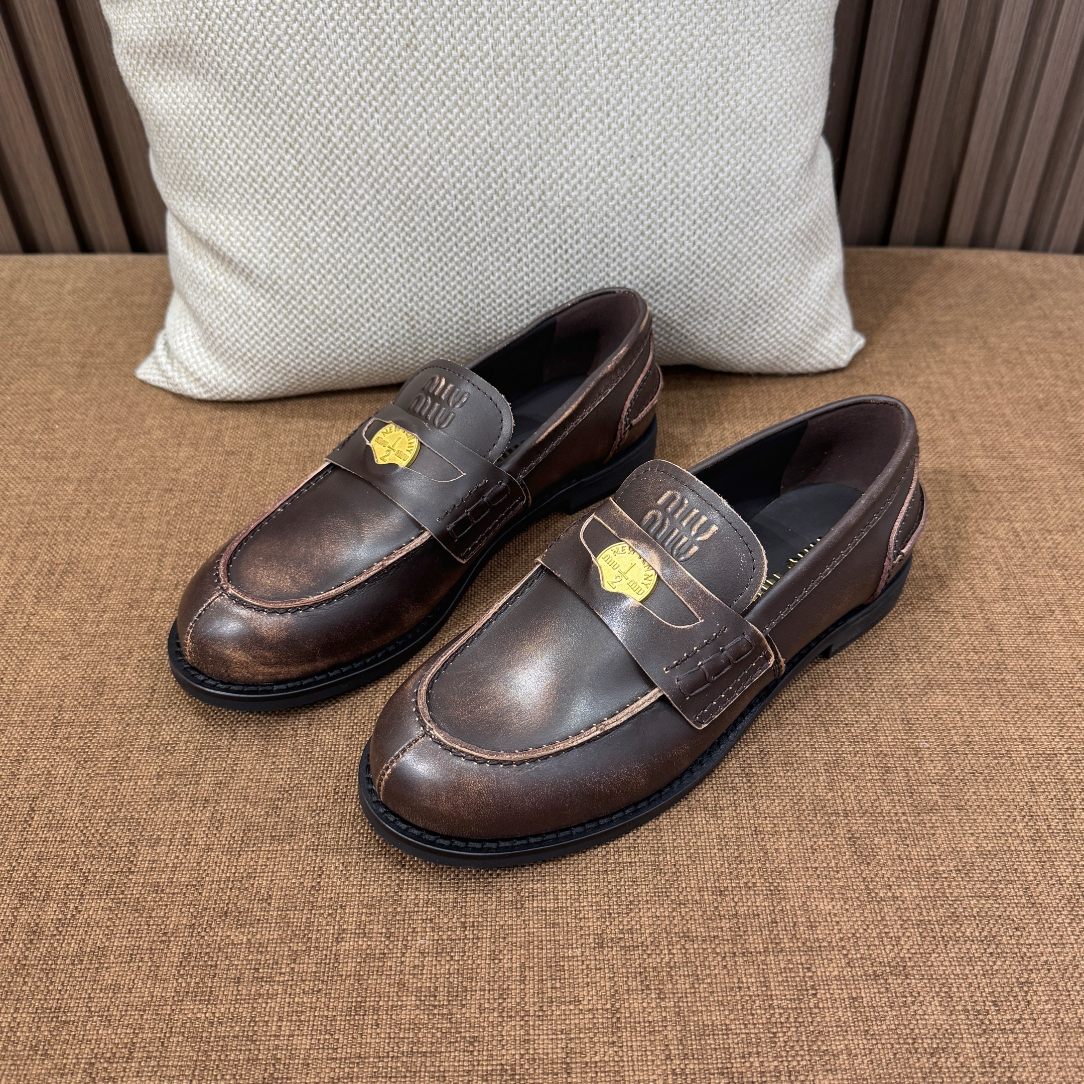미우미우 브러쉬드 가죽 페니 로퍼