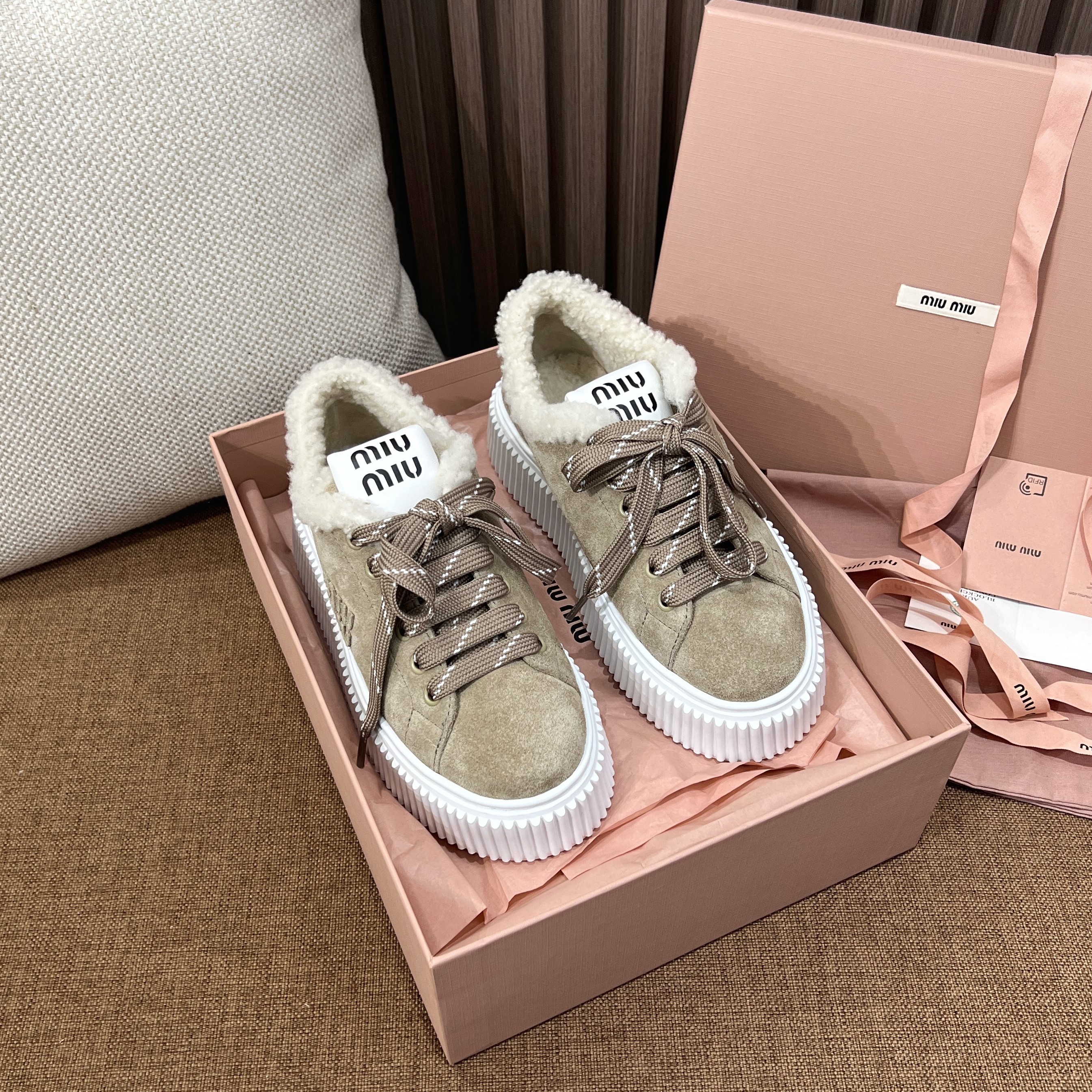 미우미우 스웨이드와 시어링 스니커즈