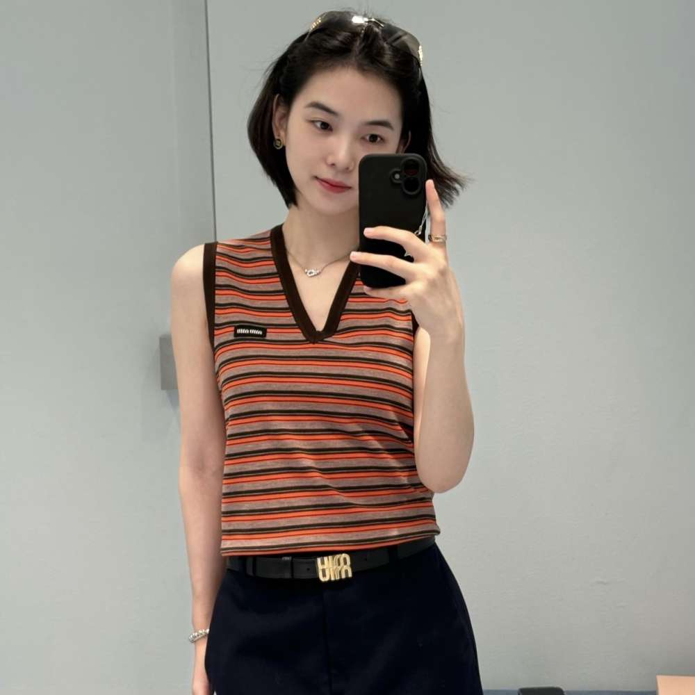 미우미우 울 브이넥 민소매 티셔츠
